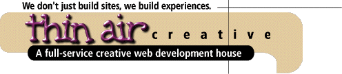 Thin Air Creative is your one stop shop for Web Development. Small companies and large companies alike have chosen Thin Air Creative as their dedicated Web source for Design, Hosting, Promotion, Maintenance and E-Commerce. Why go to several different services when you can get them all in one place and one bill? We invite you to navigate through our site and experience ......... Thin Air Creative. |