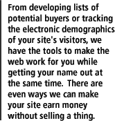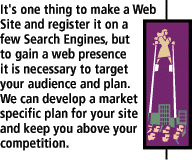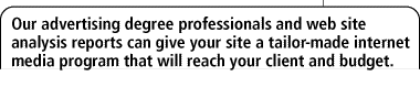 | We can put a monthly media plan together that, in addition to a routine maintenance program, will get you the exposure your site deserves. From banner ads on Yahoo to association programs, we want to get your brand familiar on the net even if it requires designing collateral materials. | |||||||
